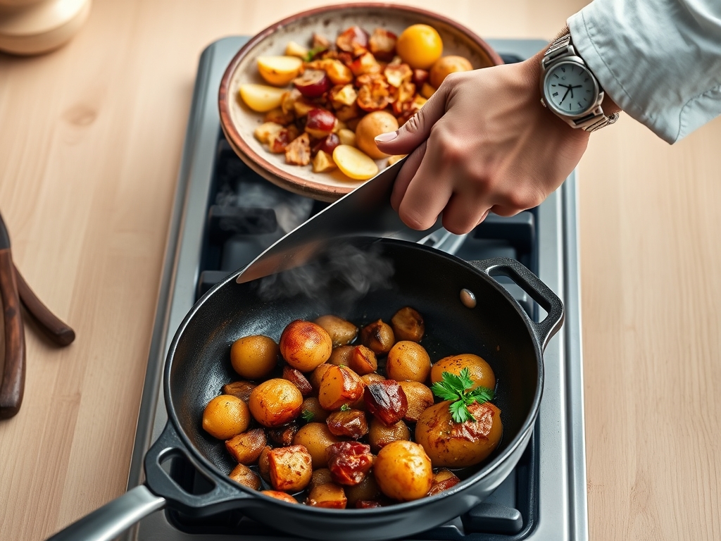 Use a metal spatula or tongs to flip the potatoes. If any bits are stuck, add a tablespoon of water or stock to deglaze the pan. The steam will lift the caramelized bits (the fond) and coat the potatoes in flavor.